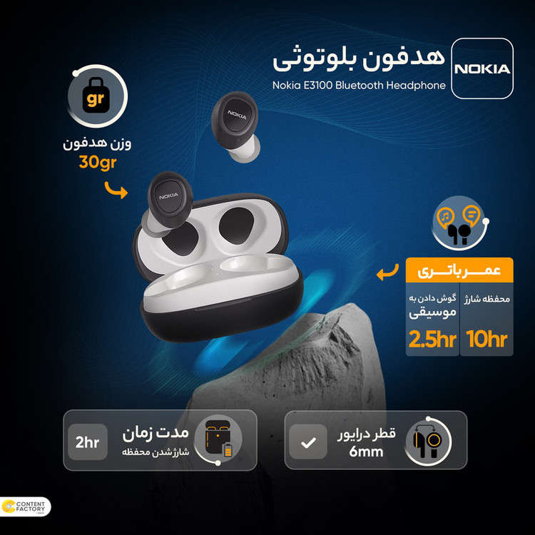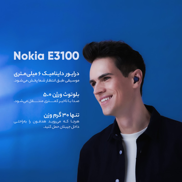 هدفون بلوتوثی نوکیا مدل E3100 محصولی با جنس عالی و طول عمر بالا از این برند است که کیفیت صدای خوبی را هم برای کاربر به ارمغان میآورد. کیفیت و جنس عالی محصولات برند نوکیا بر کسی پوشیده نیست و همین موضوع هم باعث میشود تا خیلی راحت کالاهای این برند مورد اطمینان کاربران قرار بگیرد. این هدفون به لطف طراحی ارگونومیک، احساس بسیار خوبی را به کاربر انتقال میدهد و با ظاهر زیبایش، نظر کاربران را به خود جلب میکند. این محصول به دلیل طراحی کوچک و خاصی که دارد، به طور کامل در گوش چفت میشود و به هیچ عنوان لیز نمیخورد. سریهای هدفون به راحتی قابل جداسازی و تعویض با سریهای اضافه هستند. محفظه شارژ هم طراحی بسیار زیبایی دارد و به لطف بدنهی مات، جای اثرانگشت روی آن باقی نمیماند. هدفون بلوتوثی نوکیا مدل E3100 با استفاده از بلوتوث به دستگاه مورد نظر متصل میشود و تا فاصله 10 متری از آن مورد استفاده قرار میگیرد. این محصول به کمک درایورهای شش میلیمتری، صدا را به شکل شفاف و واضح به گوش کاربر میرساند. هدفون و محفظه شارژ، هر یک برای شارژ کامل به دو ساعت زمان نیاز دارند. گوشیهای هدفون در حالت پخش موسیقی تا 2.5 ساعت قابل استفاده هستند. از طرفی عمر باتری محفظه شارژ هم به 10 ساعت میرسد. این محصول از برند نوکیا، یک انتخاب عالی برای آن دسته از کاربرانی است که به دنبال محصولی با جنس عالی برای کاربری عمومی و استفادهی روزمره هستند.