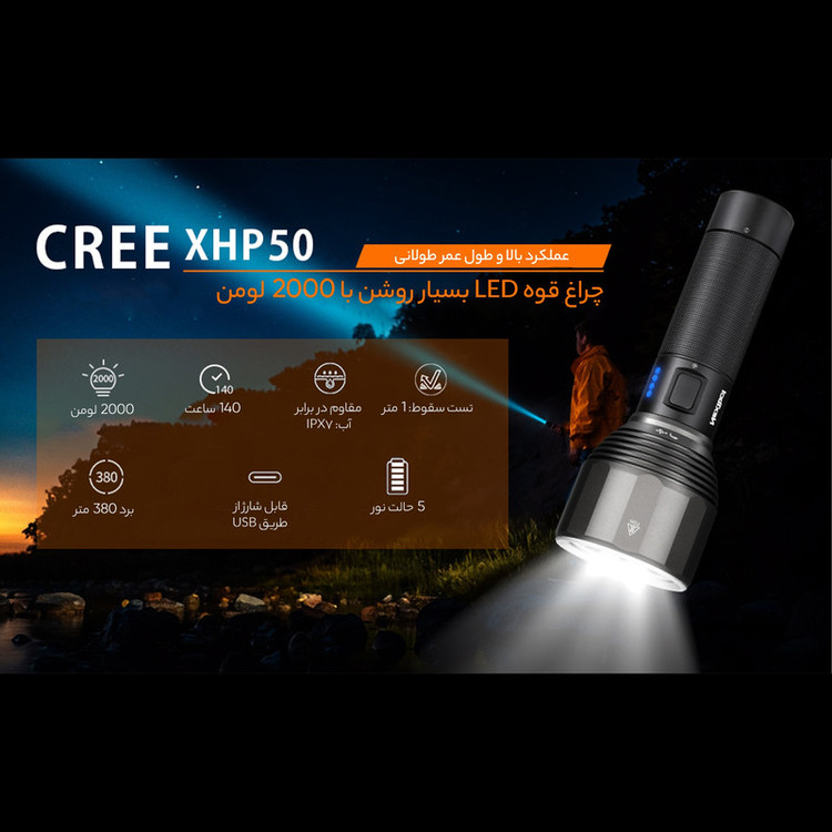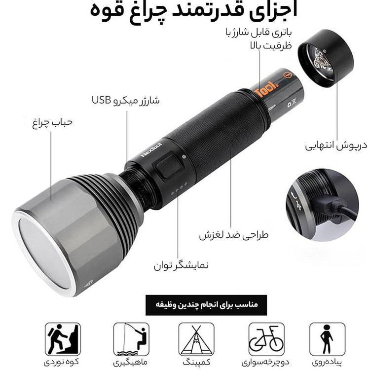 از وقتی که چراغ قوه جایگزین فانوس بادی و مشعل شد، سرعت پیشرفت این دیوایس حسابی شتاب گرفت به طوری که به واسطه کارایی وسیعی که دارد، حتی به عنوان آپشن روی موبایلها نیز دیده شد. البته اگر به صورت تخصصی به چراغ قوه نیاز داشته باشید، مدلهای معمول و رایج در بازار پاسخگوی نیاز شما نخواهند بود. در این حالت، نیاز به مدلی قدرتمندتر دارید که حرف بیشتری برای گفتن داشته باشد. شیائومی یکی از کمپانیهای فعال در تولید ملزوماتی همچون چراغ قوه به حساب میآید که با اضافه کردن برخی آپشنها، محبوبیت محصولات خود را افزایش داد. چراغ قوه شیائومی Nextool NE0126 خوش دست و زیباست، اما المان خاصی در ظاهر خود ندارد. دسته آن آرگونومیک بوده و بافت دندهدار آن، مانع از لیز خوردن و عدم ثباتش در دست شما خواهد شد. با توجه به باتری 5000 میلی آمپر ساعتی که در کالبد آلومینیومی خود جای داده اگر به دنبال یک چراغ قوه حرفهای با بدنه مستحکم و قدرت نوری بالا هستید، چراغ قوه شیائومی Nextool NE0126 را توصیه میکنیم. رایج ترین انواع چراغ قوه، روشنایی بین 50 تا 1500 لومنی دارند اما چراغ قوه شیائومی Nextool NE0126 با توجه به کارکرد حرفهای اش، نرخ فوق العاده 2000 لومن را به خود اختصاص داده است.