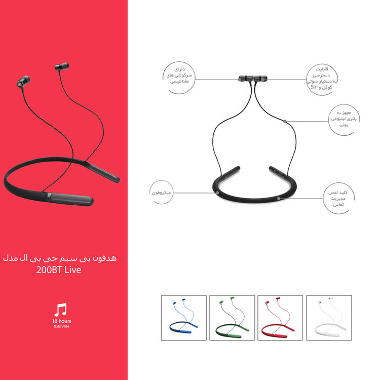 هدفون «Live 200BT» محصولی از شرکت «جی بی ال» است، که فرمی «U» شکل دارد. مزیت هدفونهای دورگردنی این است که دیگر نگران این نیستید که آن را کجا گذاشتهاید و همواره همراهتان خواهد بود. قسمت خمیده هدفون روی گردن قرار میگیرد؛ اما بهقدری سبک است که نگهداری آن هیچگونه اثری از خستگی به دنبال ندارد. اسپیکرها از طریق کابل نازکی به پنل گردنی متصل هستند و در صورت استفادهنکردن میتوان آنها را از گوش خارج کرد و به دور گردن آویخت. به لطف خاصیت آهنربایی اسپیکرها، میتوان آنها را به هم متصل کرده و هنگام راهرفتن از برخوردشان به یکدیگر جلوگیری کرد. سرگوشیهای سیلیکونی آن فوقالعاده نرم و ارگونومیک هستند و حضور طولانیمدت آنها درون گوش، خستگی یا آزردگی به دنبال ندارد. روی پنل گردنی، دکمههایی برای کنترل صدا، موسیقی و مدیریت تماس وجود دارد. باتری لیتیوم-یونی قابلشارژ آن 170 میلیآمپرساعت ظرفیت دارد برای10 ساعت مکالمه یا پخش موسیقی شارژ داشته باشد. هدفون بیسیم جی بی ال مدل Live 200BT با ویژگیهای مذکور، ابزاری حرفهای برای گوشدادن به موسیقی و مدیریت تماسها بهویژه برای افراد پرتحرک یا ورزشکار است.